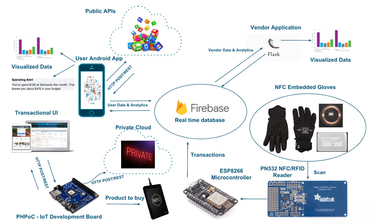 IoT Solution - The proof-of-concept involves a winter glove enabled with Near Field Communication (NFC) technology called Ge$ture that allows users to successfully complete payments merely by gesturing towards an NFC-enabled point-of-sale terminal. All transactions are linked to a mobile application that the user can access to view infographics on spending patterns and receive smart suggestions. We have also setup a user interface that mimics a vendor catalog and a web-based data analytics tool for the vendor to monitor product consumption and stay competitive in the market.